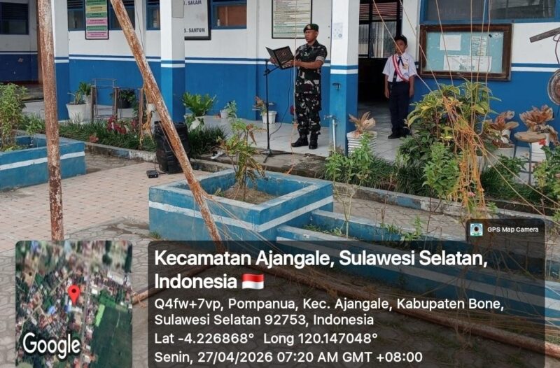 BONE – Babinsa Koramil 1407-01/Ajangale Sertu Idris bertindak sebagai Inspektur Upacara (Irup) pada upacara bendera hari Senin di SMP Negeri 1 Ajangale, Kelurahan Pompanua, Kecamatan Ajangale, Kabupaten Bone. Senin (27/04/26).