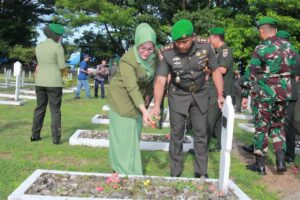 BONE – Dandim 1407/Bone Letkol Inf Laode Muhammad Idrus bersama Ketua Persit KCK Cabang XXV Dim 1407/Bone, Ny. Nur Fitriati Laode hadiri ziarah rombongan dalam rangka memperingati Hari Juang TNI AD ke 80 di Taman Makam Pahlawan (TMP) Watampone, Kec. Tanete Riattang, Kab. Bone. Kamis (11/12/25).