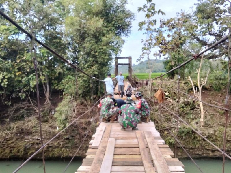 Koramil 1407-15/Mare Gelar Karya Bakti, Perbaiki Jembatan Gantung Terdampak Banjir di Desa Ujung Tanah