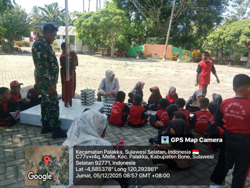 BONE – Babinsa Koramil 1407-21/Palakka, Serda Andi Aksan, melaksanakan pendampingan pemberian makanan gratis dan bergizi kepada anak-anak Sekolah Dasar SD Inpres 4/82 Melle yang berlokasi di Desa Melle, Kecamatan Palakka, Kabupaten Bone. Jumat Siang (05/12/25).