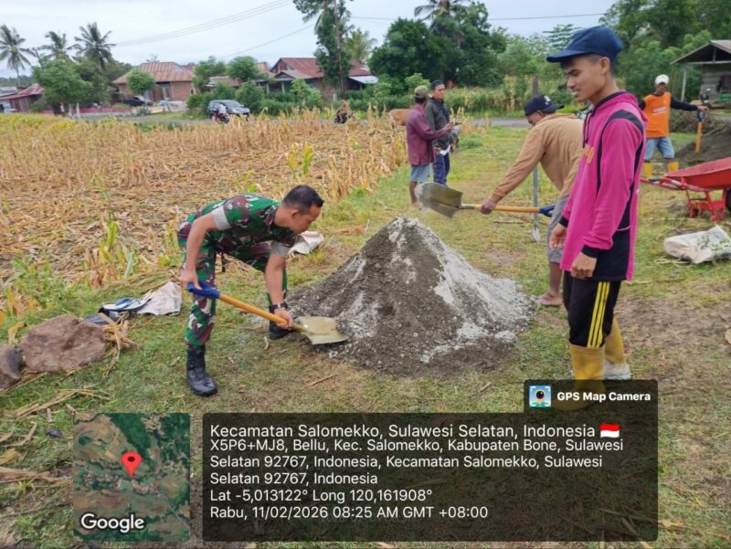 Bone – Babinsa Koramil 1407-17/Salomekko melaksanakan gotong royong membantu warga binaan dalam pembangunan talud di Desa Bellu, Kec. Salomekko, Kab. Bone. Rabu siang (11/02/26).