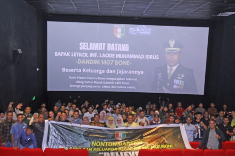 BONE – Dandim Letkol Inf. Muhammad Idrus, memboyong keluarga besar Kodim 1407/Bone hadiri acara Nonton Bareng (Nobar) perdana film “Believe” yang digelar di Planet Cinema Bone, Jl. Dr. Wahidin Sudirohusodo, Kec. Tanete Riattang, Kab. Bone. Kamis Malam (24/07/24).