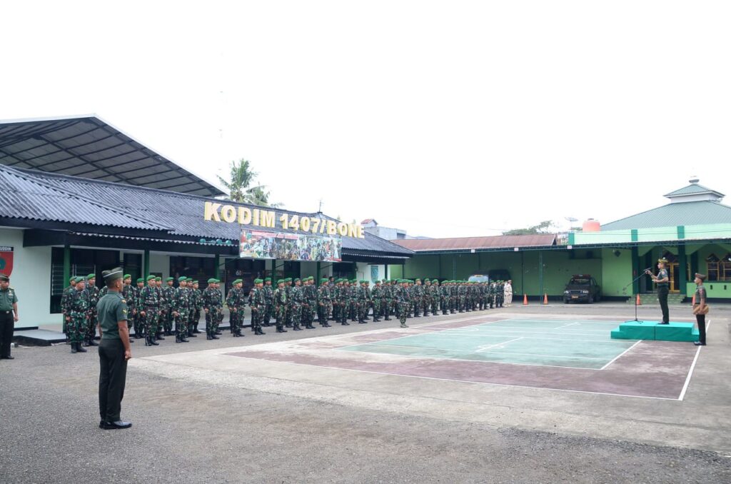 BONE – Kodim 1407/Bone Rem 141/Tp melaksanakan upacara bendera mingguan yang rutin digelar setiap hari Senin, bertindak sebagai Inspektur Upacara (Irup) Dandim 1407/Bone Letkol Inf. Moch. Rizqi Hidayat Djohar yang diikuti seluruh TNI dan PNS Kodim 1407/Bone, bertempat di lapangan Makodim Jl. Lapatau, Kab. Bone. Senin (04/09/23).