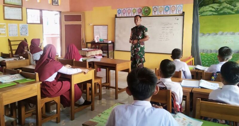 BONE – Babinsa Koramil 1407-03/Cenrana Sertu Syafaruddin memberikan materi tentang kedisiplinan kepada siswa SDN 79 yang terletak di Desa Ujung Tanah, Kec. Cenrana, Kab. Bone. Selasa (24/02/26).