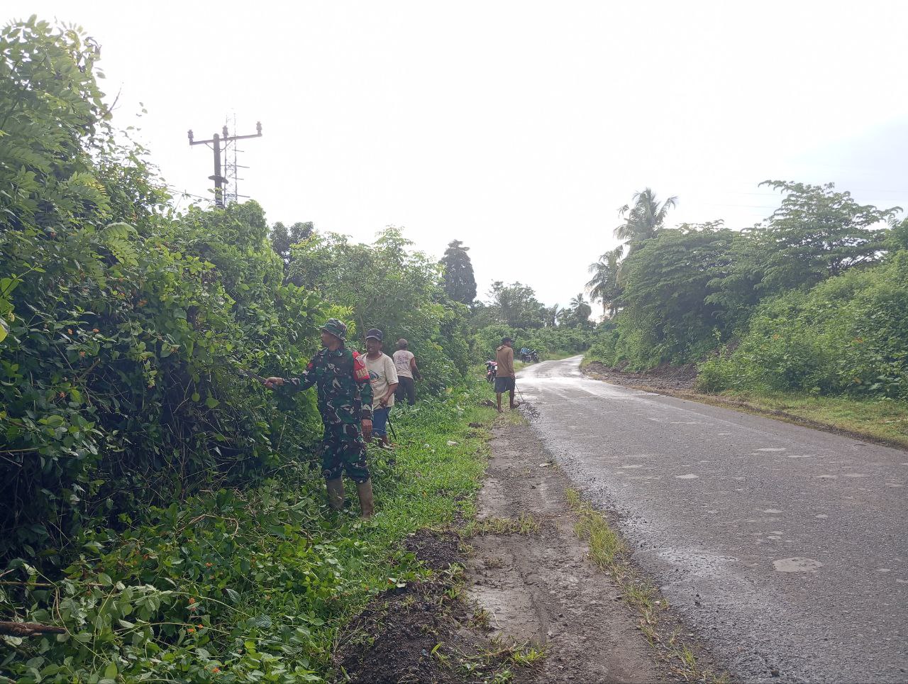 TNI & POLRI Kemanunggalan Di Desa Carigading : Babinsa Koramil 1407-06/Awangpone Gerakkan Semangat Gotong Royong Bersihkan Desa