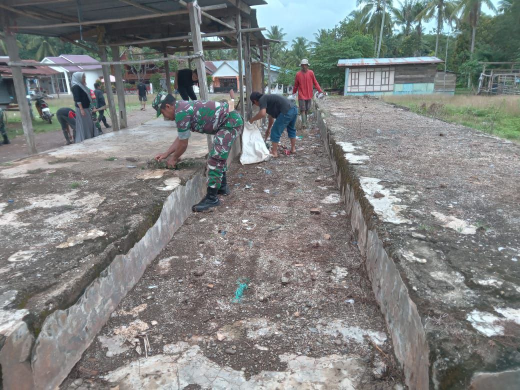 Kemanunggalan Di Desa Carigading : Babinsa Koramil 1407-06/Awangpone Gerakkan Semangat Gotong Royong Bersihkan Desa