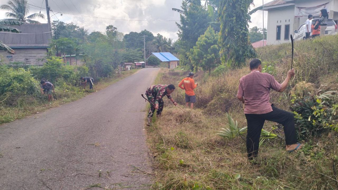 Kemanunggalan Di Desa Carigading : Babinsa Koramil 1407-06/Awangpone Gerakkan Semangat Gotong Royong Bersihkan Desa