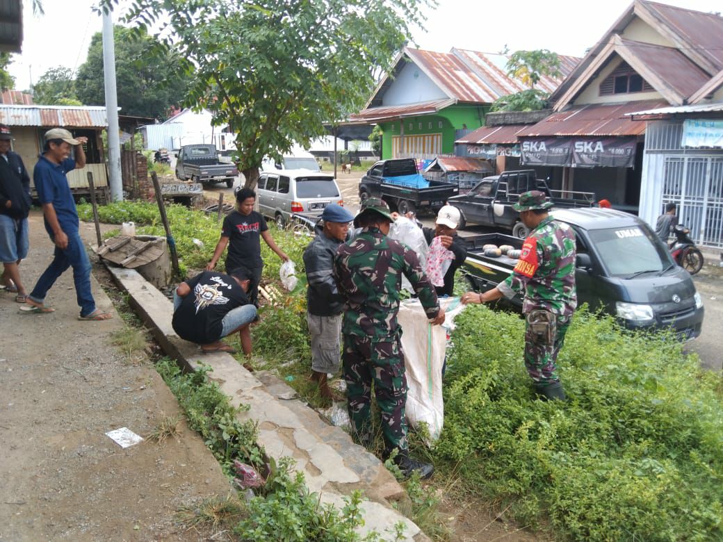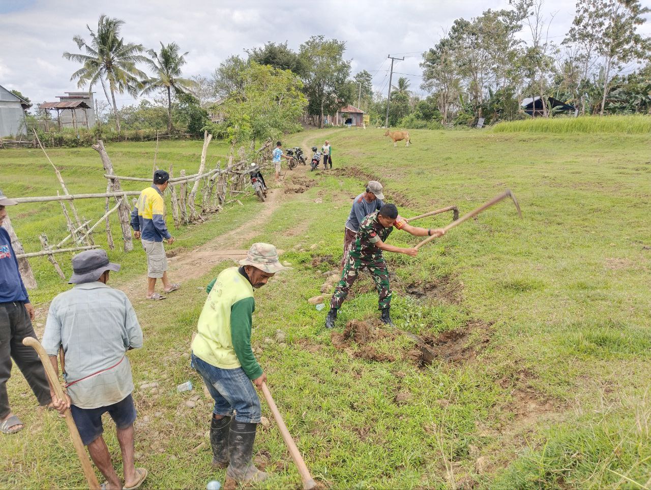 Budayakan Gotong Royong, Babinsa Koramil 1407-09/Lapri Ajak Warga Patangkai Percantik Alun-Alun Desa