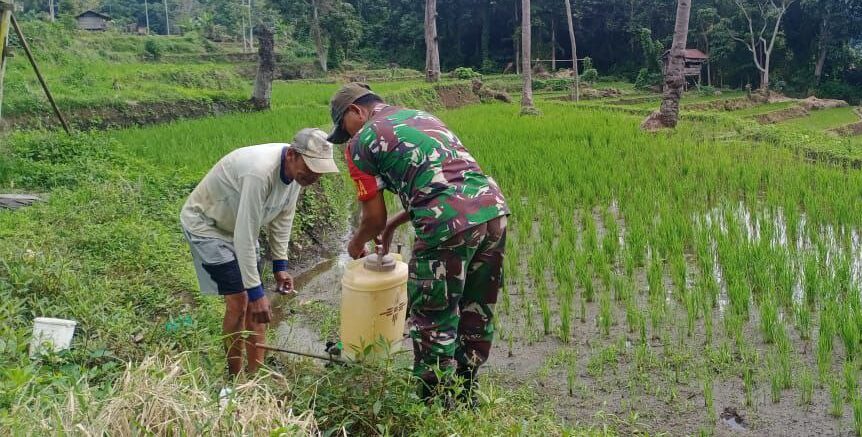 TNI & POLRI Budayakan Gotong Royong, Babinsa Koramil 1407-09/Lapri Ajak Warga Patangkai Percantik Alun-Alun Desa