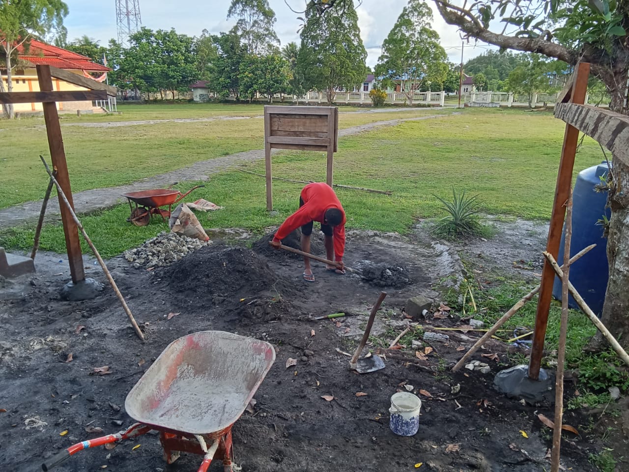 Budayakan Gotong Royong, Babinsa Koramil 1407-09/Lapri Ajak Warga Patangkai Percantik Alun-Alun Desa