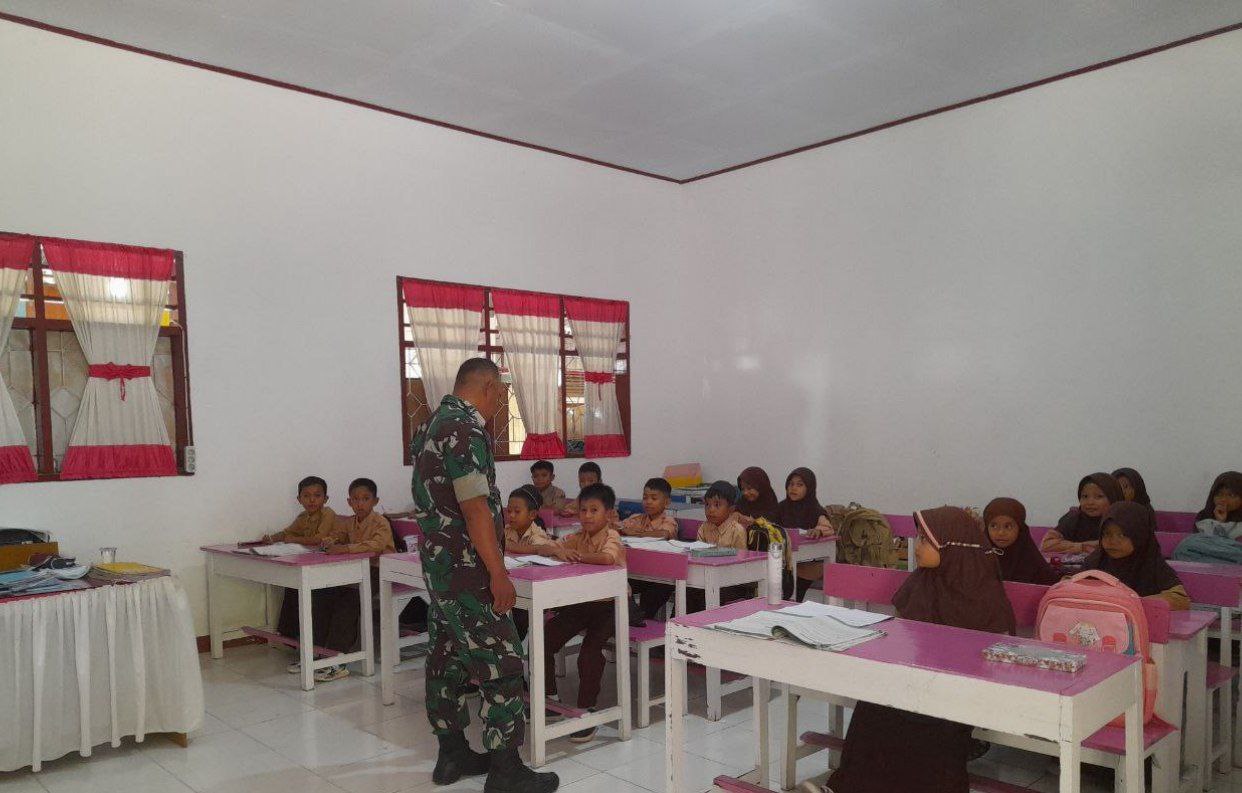 TNI & POLRI Bentuk Karakter Generasi Muda, Babinsa Libureng Kodim 1407/Bone Latih Baris-Berbaris Murid SD