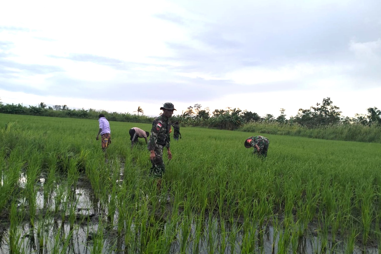 Budayakan Gotong Royong, Babinsa Koramil 1407-09/Lapri Ajak Warga Patangkai Percantik Alun-Alun Desa