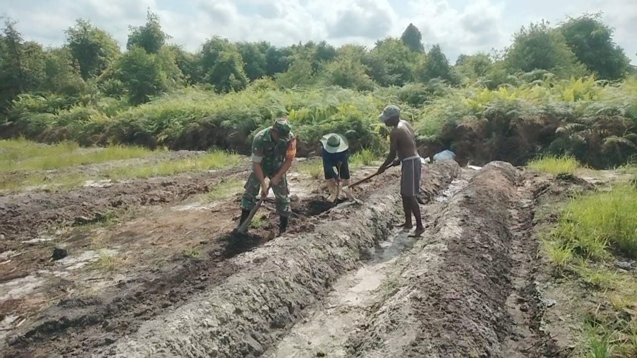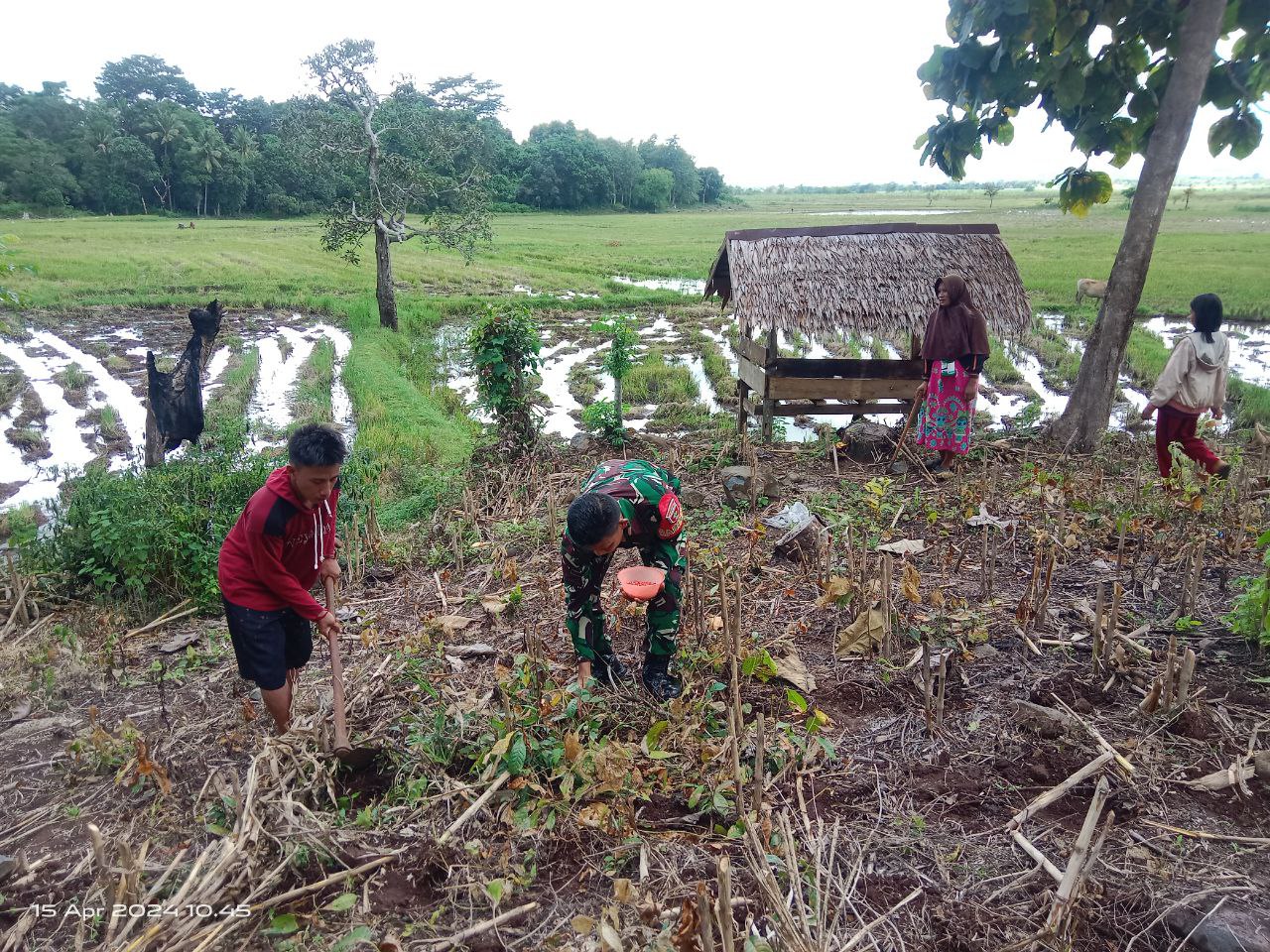 Budayakan Gotong Royong, Babinsa Koramil 1407-09/Lapri Ajak Warga Patangkai Percantik Alun-Alun Desa