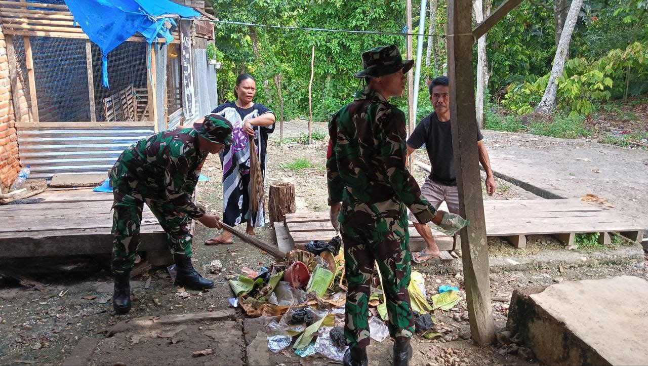 Kemanunggalan Di Desa Carigading : Babinsa Koramil 1407-06/Awangpone Gerakkan Semangat Gotong Royong Bersihkan Desa