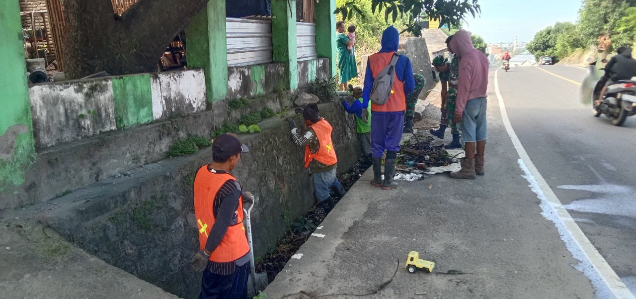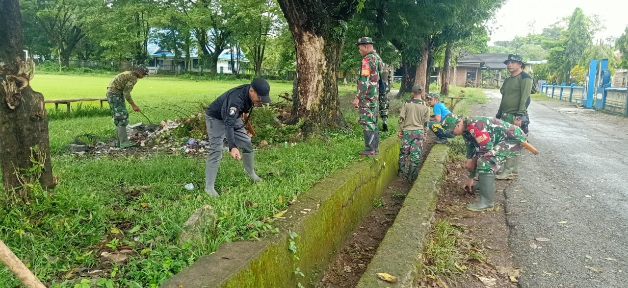 TNI & POLRI Kemanunggalan Di Desa Carigading : Babinsa Koramil 1407-06/Awangpone Gerakkan Semangat Gotong Royong Bersihkan Desa