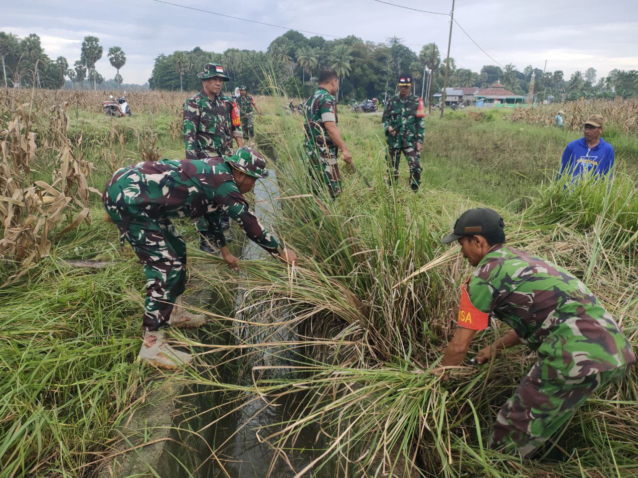 Kemanunggalan Di Desa Carigading : Babinsa Koramil 1407-06/Awangpone Gerakkan Semangat Gotong Royong Bersihkan Desa