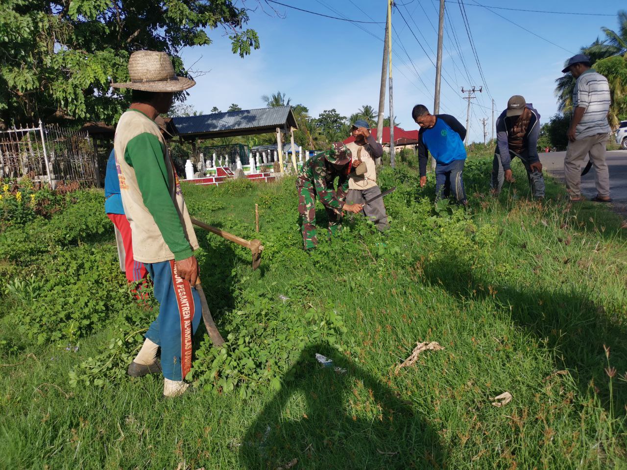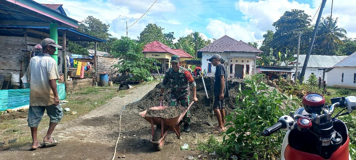 Kemanunggalan Di Desa Carigading : Babinsa Koramil 1407-06/Awangpone Gerakkan Semangat Gotong Royong Bersihkan Desa