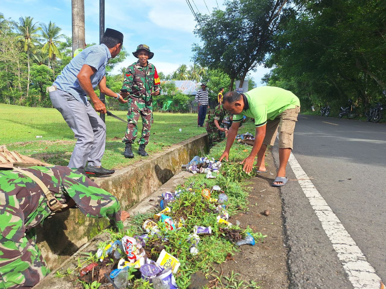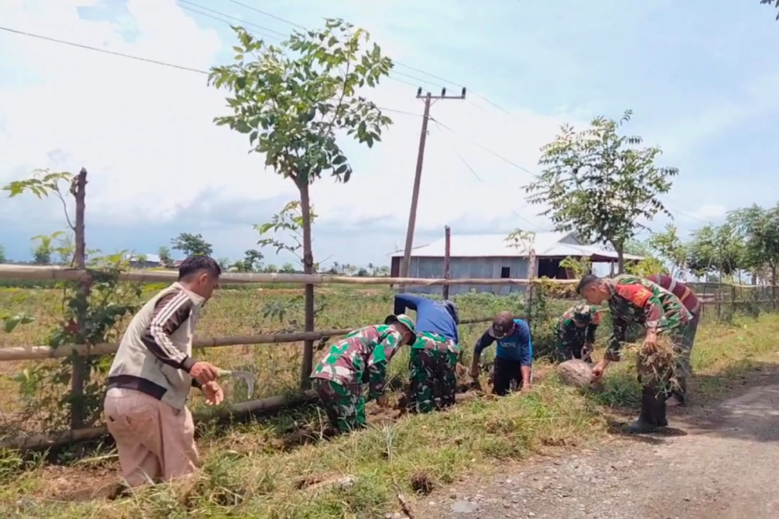Kemanunggalan Di Desa Carigading : Babinsa Koramil 1407-06/Awangpone Gerakkan Semangat Gotong Royong Bersihkan Desa