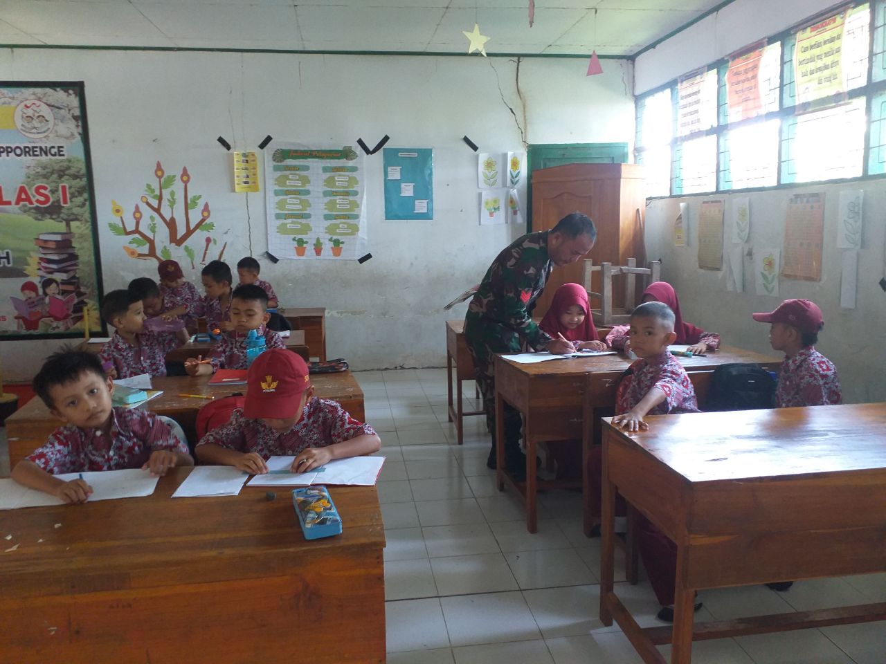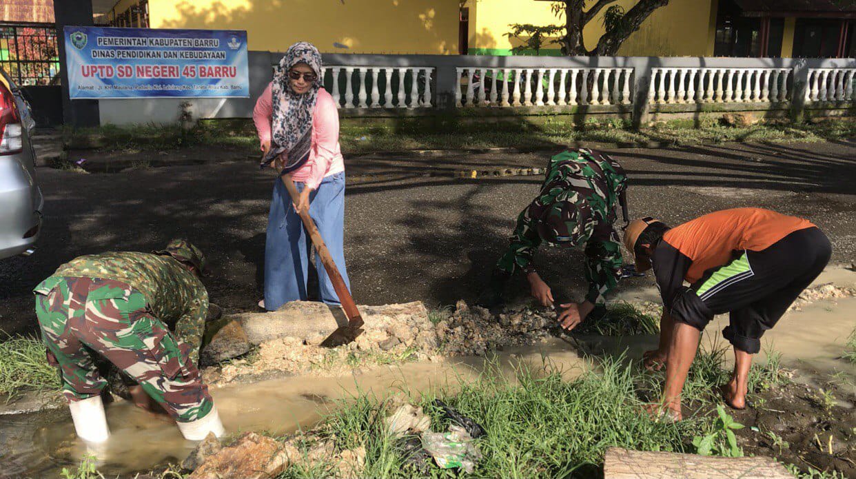 TNI & POLRI Aksi Kompak Babinsa Koramil 1407-03/Cenrana Dan Siswa SD Inpres Watu : Kerja Bakti Perindah Sekolah