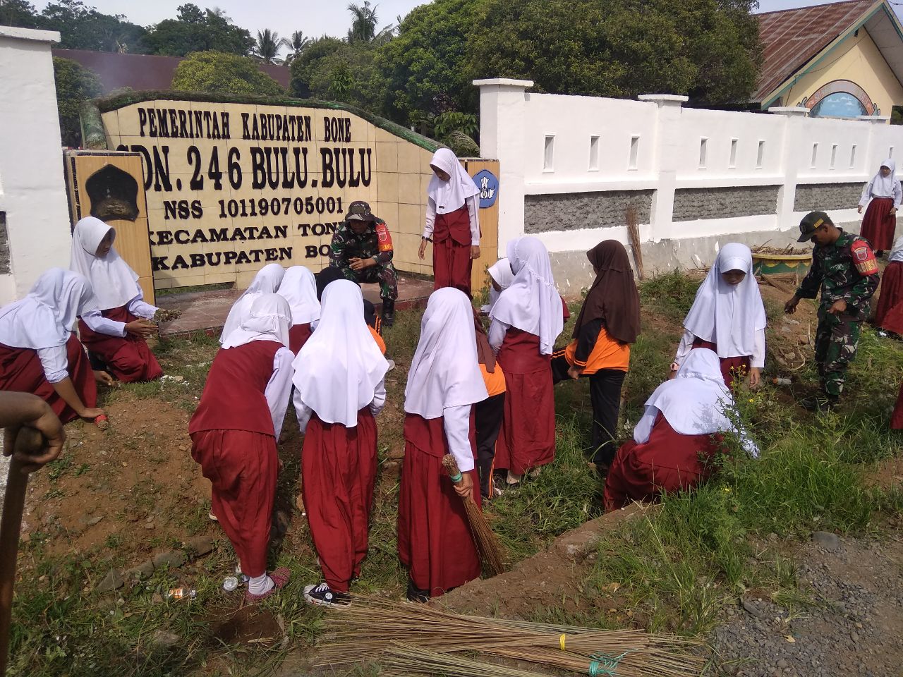 TNI & POLRI Aksi Kompak Babinsa Koramil 1407-03/Cenrana Dan Siswa SD Inpres Watu : Kerja Bakti Perindah Sekolah