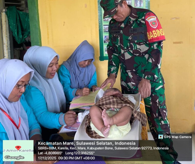 BONE – Babinsa Koramil 1407-15/Mare Serma Abd. Rahman mendampingi petugas kesehatan Puskesmas Mare dalam kegiatan Posyandu yang diselenggarakan di Desa Karella, Kec. Mare, Kab. Bone. Rabu siang (17/12/25).