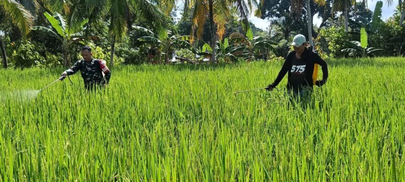 Sertu Ervan turun langsung ke sawah untuk memastikan proses penyemprotan hama dilakukan dengan tepat, aman, dan efektif, sekaligus memberikan arahan kepada petani mengenai teknik pengendalian hama yang ramah lingkungan.