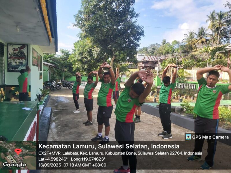 BONE – Dalam rangka menjaga kebugaran dan meningkatkan stamina, personel Koramil 08/Lamuru Kodim 1407/Bone melaksanakan kegiatan senam pagi yang dilanjutkan dengan lari jalan di jalan poros Lalebata, Kec. Lamuru, Kab. Bone. Selasa (16/09/2025).