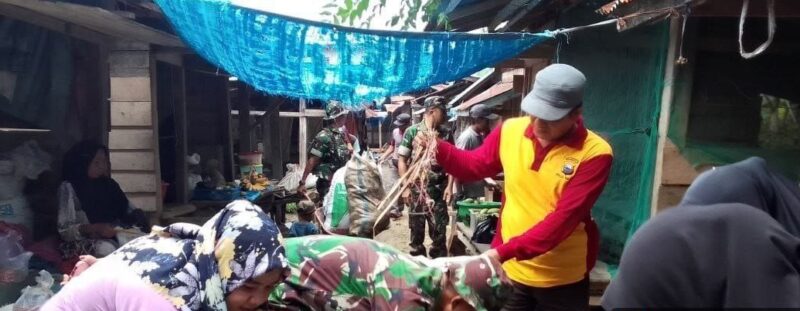 Pembersihan dilakukan secara gotong royong dengan menyasar area pasar yang dipenuhi sampah dan saluran air yang tersumbat.