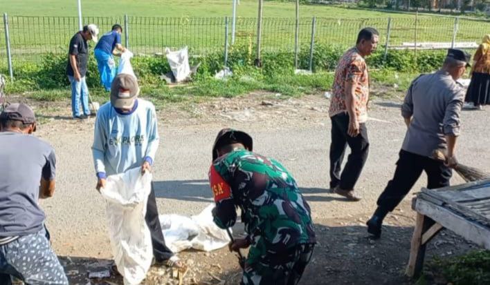 Sampah-sampah yang menumpuk di sekitar pasar dibersihkan secara bersama-sama oleh anggota TNI dan masyarakat setempat.
