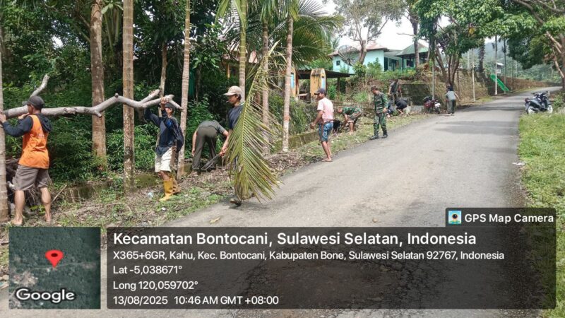 BONE – Dalam rangka menyambut peringatan Hari Ulang Tahun (HUT) Kemerdekaan RI ke-80, Personil Koramil 1407-20/Bontocani bersama masyarakat melaksanakan kerja gotong royong pembersihan jalan poros di Kelurahan Kahu, Kecamatan Bontocani, Kabupaten Bone. Rabu sore (13/08/25).