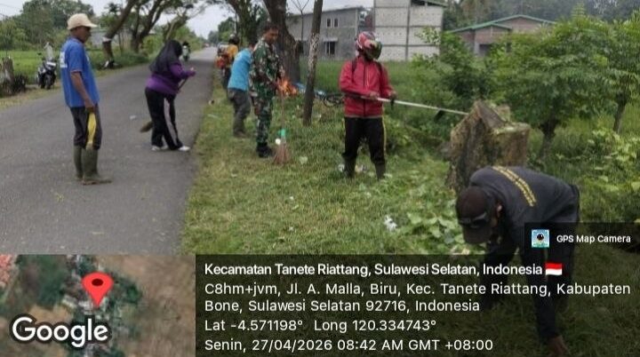 BONE – Babinsa Koramil 1407-07/Tanete Riattang, Sertu Sainuddin, melaksanakan karya bakti pembersihan lingkungan bersama Satgas kebersihan dan warga di Kelurahan Mannurunge, Kecamatan Tanete Riattang, Kabupaten Bone. Senin siang (27/04/26).