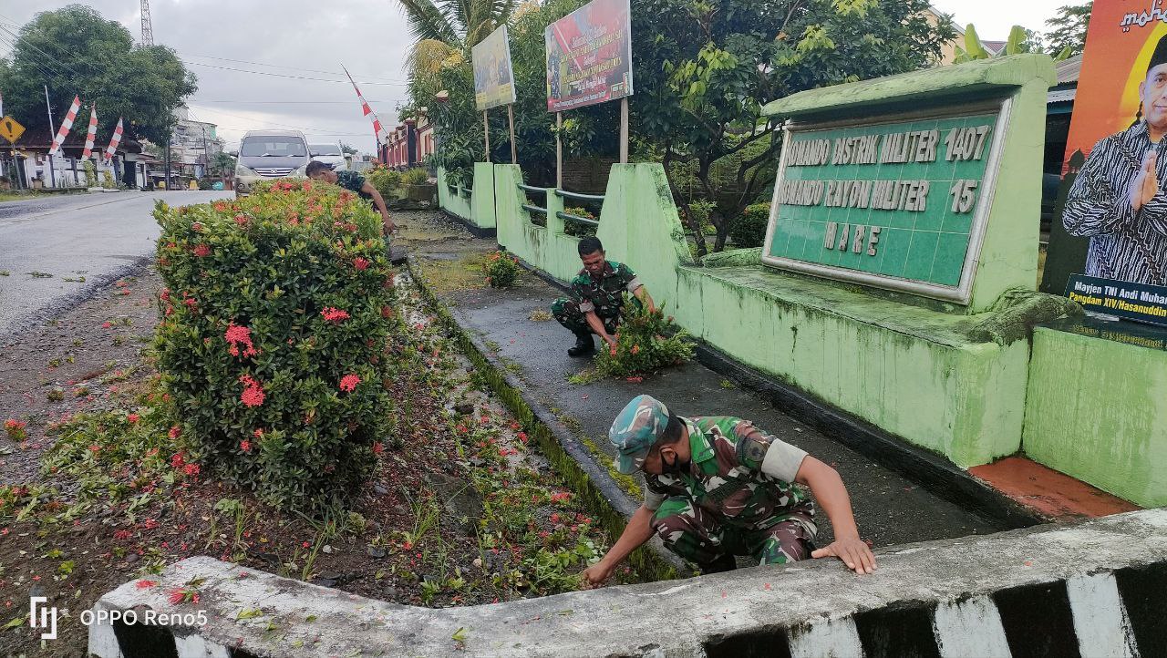 BONE – Dengan didasari kesadaran tentang pentingnya menjaga kebersihan,agar tetap selalu rapi,bersih, dan indah dipandang, Personel Koramil 15/Mare melaksanakan pembersihan Pangkalan,