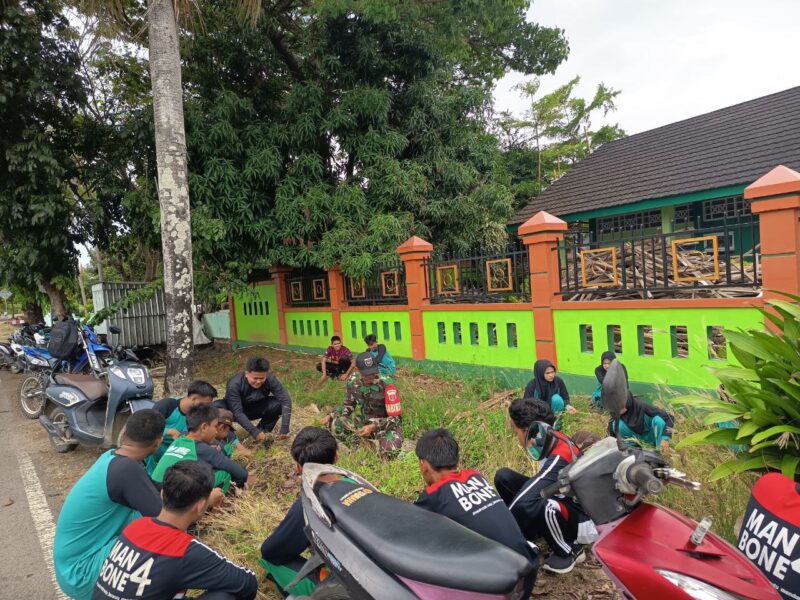 BONE – Babinsa Koramil 1407-18/Kajuara Serda Sapiuddin melaksanakan kerja bakti bersama para siswa MAN 4 Bone dengan membersihkan halaman sekolah di Kel. Awangtangka, Kec. Kajuara, Kab. Bone. Sabtu (29/11/25).