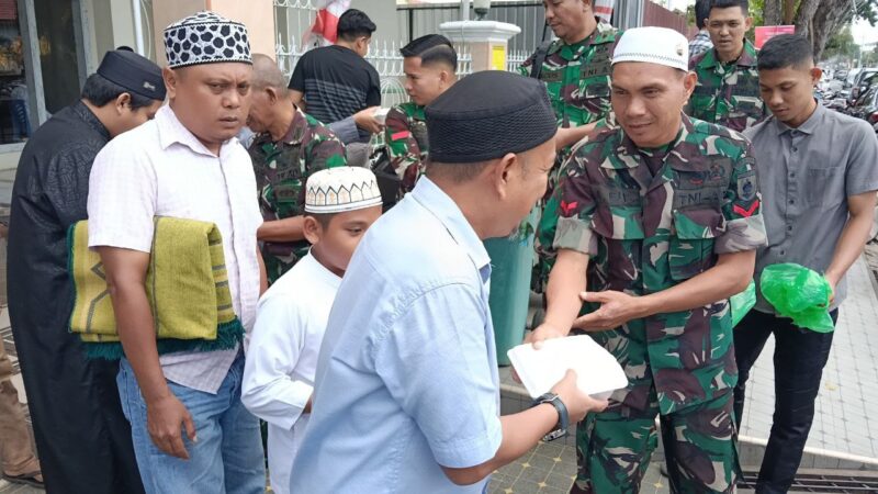 BONE – Dalam semangat Jumat Berkah, Dandim 1407/Bone Letkol Inf. Laode Muhammad Idrus kembali menunjukkan kepedulian sosial dengan menyapa langsung warga Bone dan menerjunkan personelnya berbagi ratusan nasi kotak kepada jamaah Masjid Al-Mubarak, yang berlokasi di Jl. MH. Thamrin, Kel. Ta, Kec. Tanete Riattang Timur, Kab. Bone. Jumat (22/08/25).