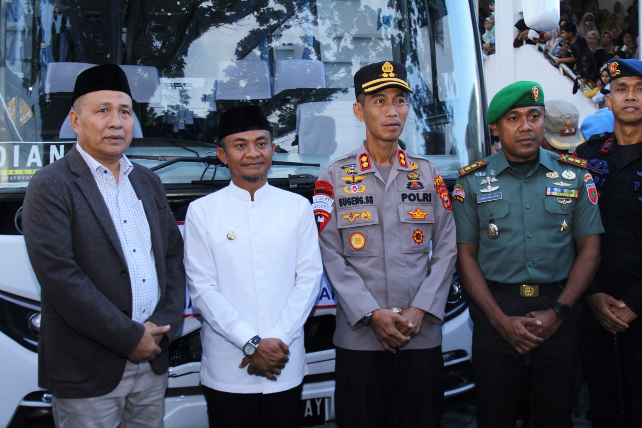 BONE – Dandim 1407/Bone Letkol Inf Laode Muhammad Idrus turut serta bersama Forkopimda melepas jemaah calon haji Kloter I tahun 1446 H/2025 M, bertempat di Pelataran Masjid Al Markaz Watampone, Jl. Ahmad Yani, Kab. Bone. Jumat (02/05/2025).