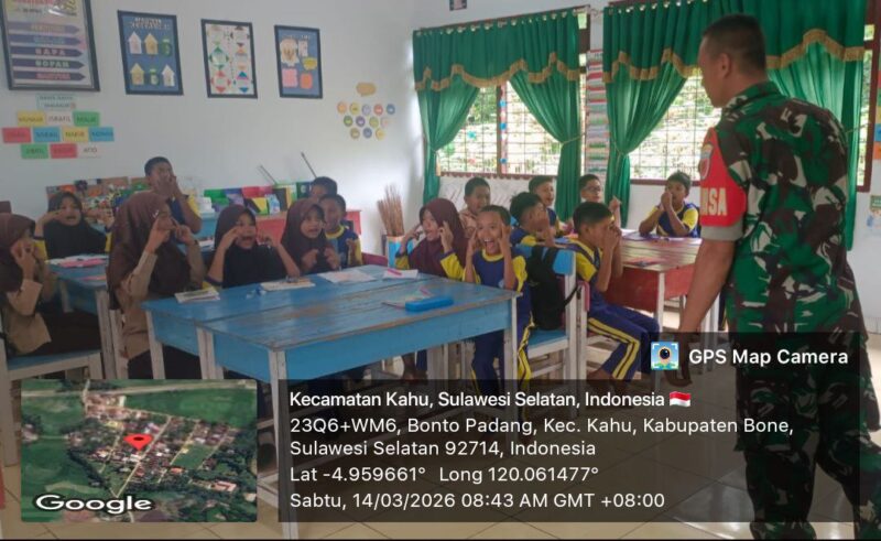 Bone – Babinsa Koramil 1407-19/Kahu Serda Syukur memberikan materi pelajaran matematika melalui sistem gasing kepada siswa SD Inpres 6/86 di Desa Bontopadang, Kec. Kahu, Kab. Bone. Sabtu siang (14/03/26).