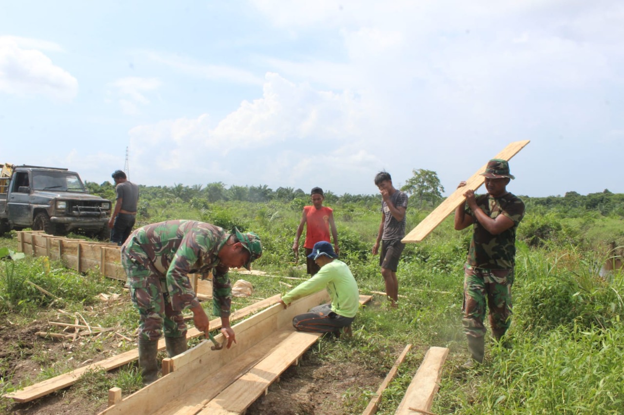 Nagan Raya – Satgas TMMD Kodim 0116/Nagan Raya melaksanakan pembuatan papan mal jembatan papan mal yang berfungsi untuk menahan curahan adukan dan pembentukan pondasi dari semen, pengerjaannya dilakukan di lokasi pembuatan jembatan di Desa Cot Kumbang Kecamatan Kuala Kabupaten Nagan Raya, Jumat(13/05/2022).