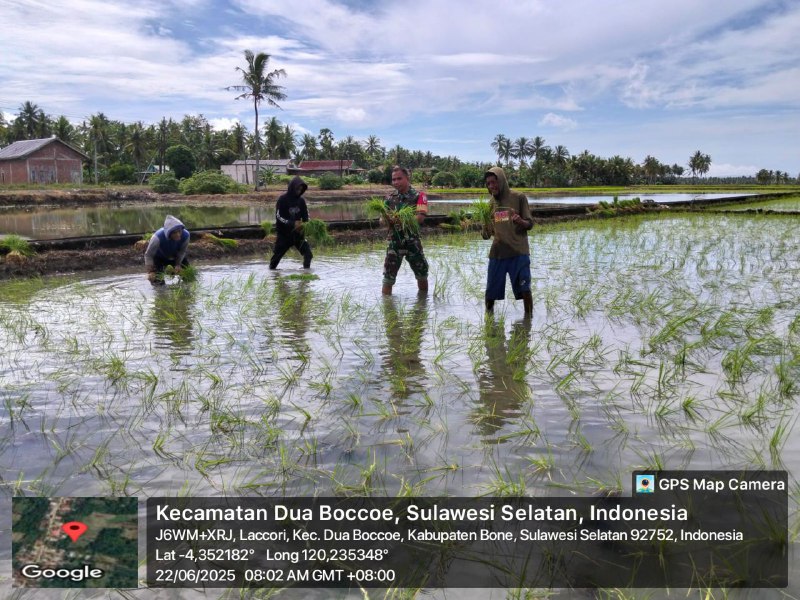 Bone – Dalam rangka mendukung program swasembada pangan nasional, Babinsa Koramil 1407-02/Dua Boccoe, Sertu Agustang C, melaksanakan pendampingan tanam padi bersama kelompok tani di…