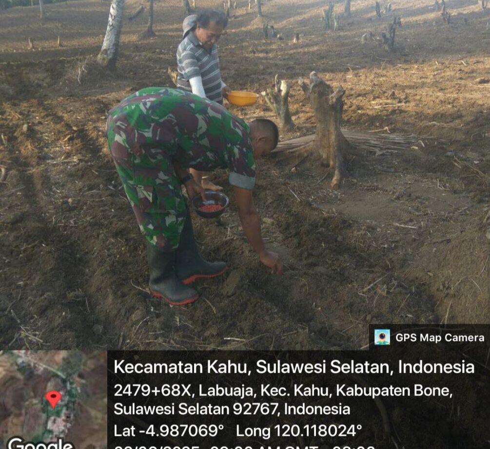 BONE – Tingkatkan ketahanan pangan di desa binaan, Babinsa Koramil 19/Kahu Kodim 1407/Bone Sertu Bambang membantu petani menanam jagung di Desa Labuaja, Kac. Kahu,…