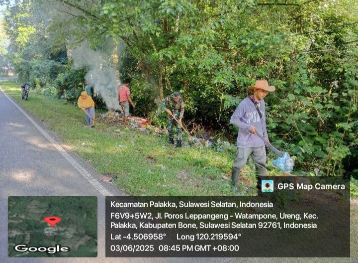 BONE – Babinsa Koramil 21/Palakka Kodim 1407/Bone Sertu Kahar gotong royong melaksanaan kerja bakti pembersihan sampah-sampah di wilayah binaannya di Desa Ureng, Kecamatan Palakka,…