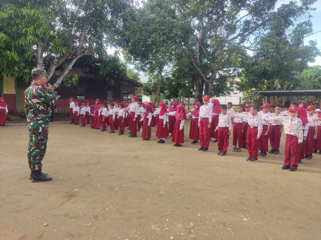 BONE – Babinsa Koramil 03/Cenrana Kodim 1407/Bone Serda Risal Jaya melaksanakan pemberian materi Peraturan Baris Berbaris (PBB) kepada siswa di sekolah SDN No. 77…