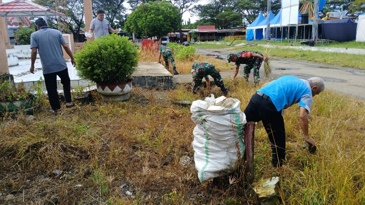Bone – Babinsa Koramil 1407-01/Ajangale bersama Staf Kecamatan Ajangale melaksanakan kegiatan karya bakti di area sekitar kantor Kecamatan yang terletak di Kel. Pompanua, Kec….