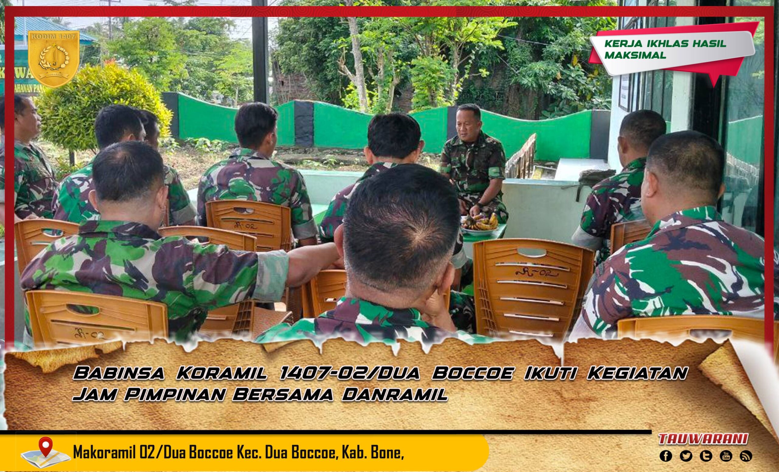 Bone – Babinsa Koramil 1407-02/Dua Boccoe melaksanakan kegiatan jam pimpinan yang dipimpin langsung oleh Danramil Kapten Arh Ruslan di halaman Makoramil Kec. Dua Boccoe,…