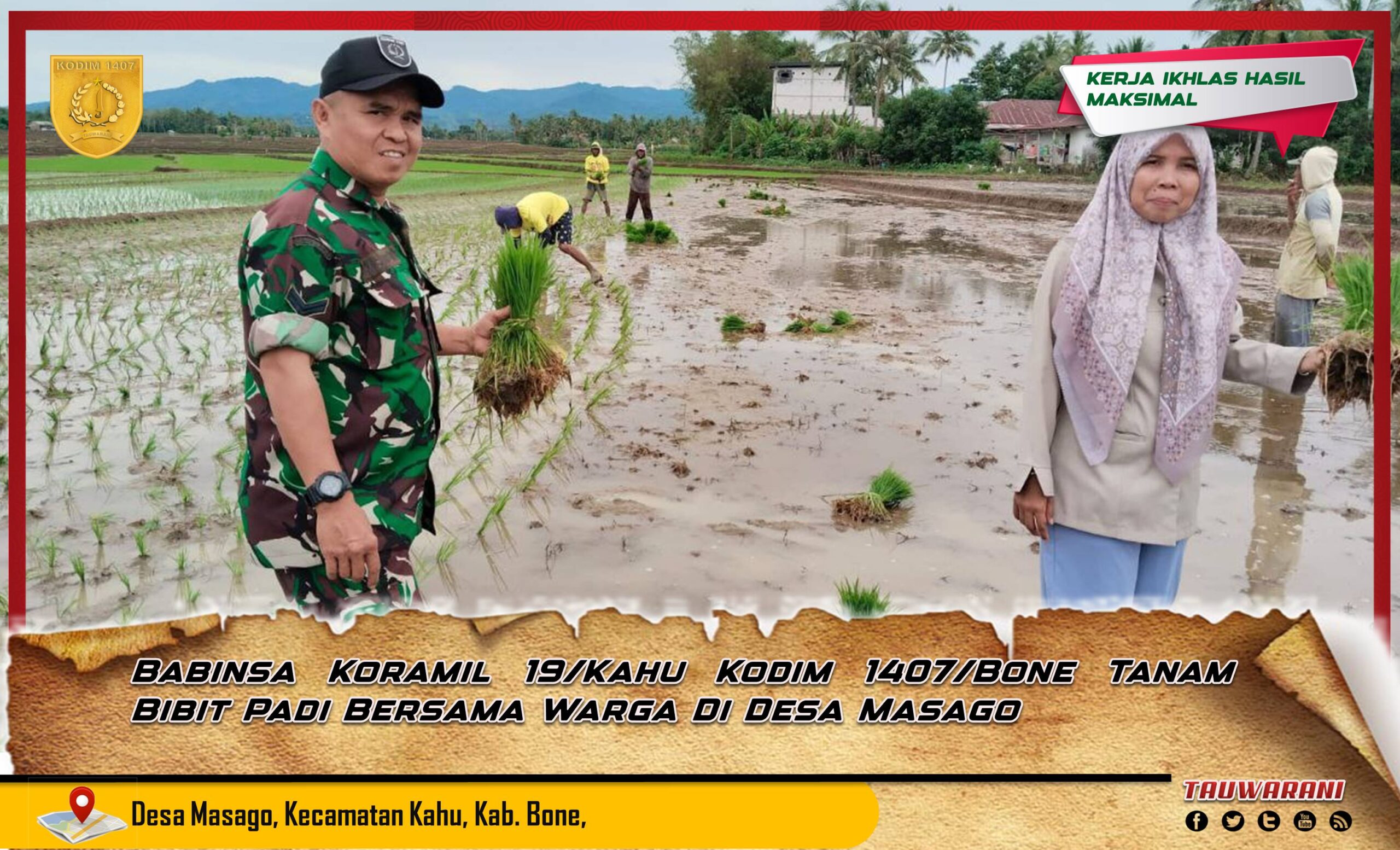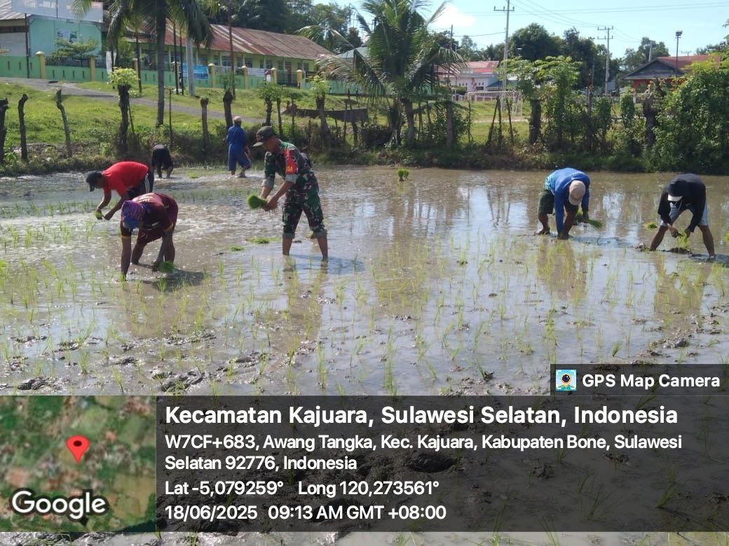 Bone – Babinsa Koramil 18/Kajuara Kodim 1407/Bone Serda Mursaling turut serta bersama warga menanam padi di sawah milik Warga setempat di Kelurahan Awang Tangka,…