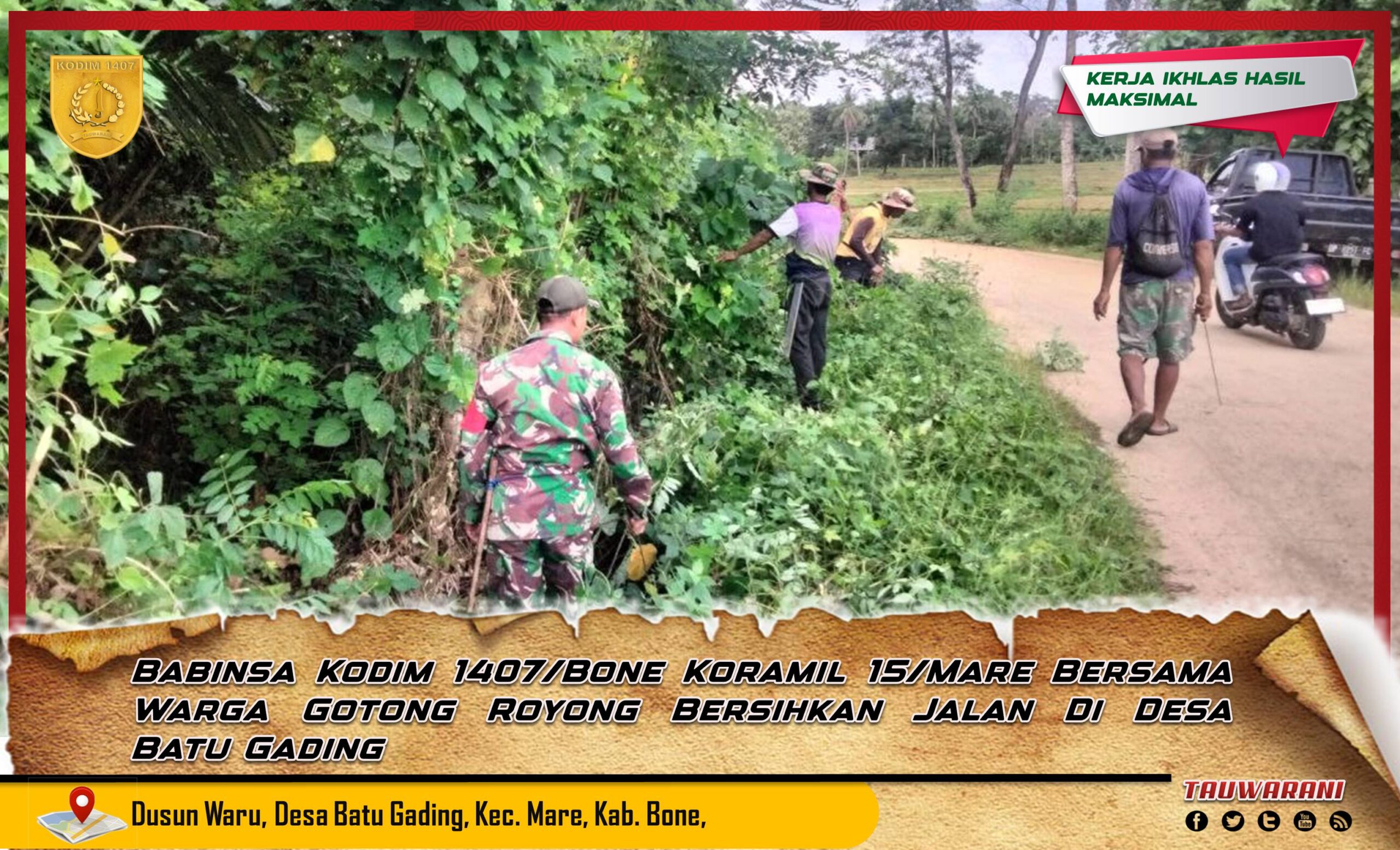Bone – Babinsa Koramil 1407-15/Mare, Sertu Ismail, melaksanakan gotong royong bersama masyarakat membersihkan rumput liar yang tumbuh di pinggir badan jalan di Dusun Waru,…
