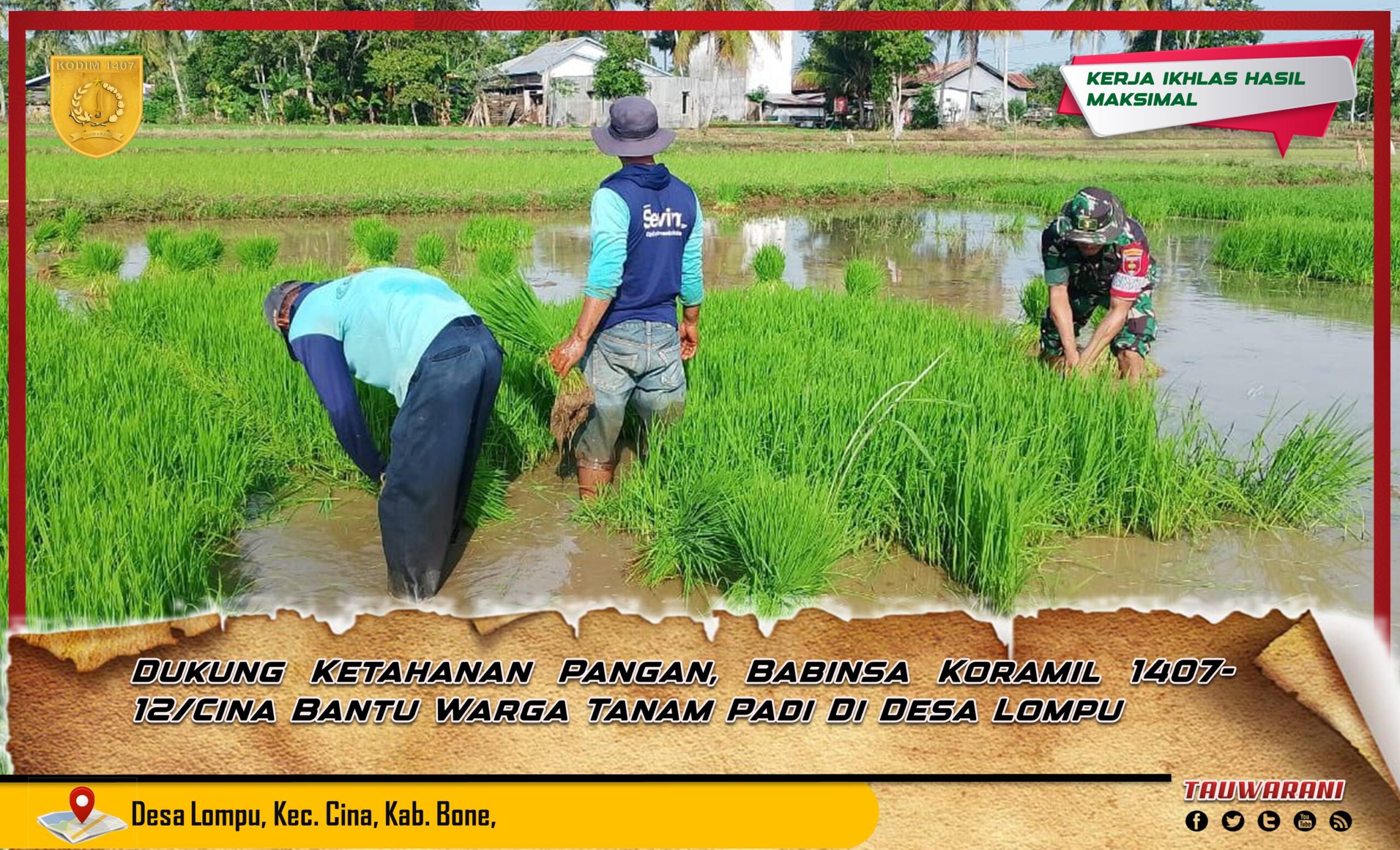 Bone – Dalam upaya mendukung program ketahanan pangan nasional, Babinsa Koramil 1407-12/Cina Pelda Syarifuddin turun langsung ke sawah membantu para petani menanam padi di…