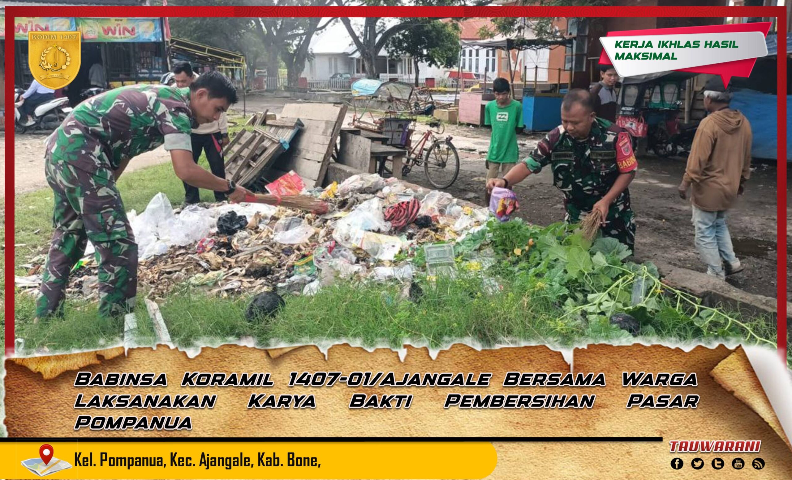 Bone – Dalam rangka meningkatkan kebersihan lingkungan dan mencegah penyebaran penyakit, Babinsa Koramil 1407-01/Ajangale bersama warga setempat melaksanakan karya bakti pembersihan Pasar di Kel….