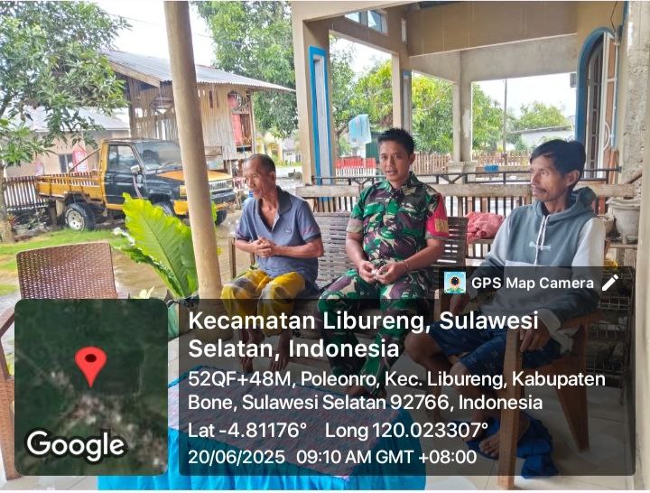 Bone – Serda Ruslan, Babinsa Koramil 14/Libureng, Kodim 1407/Bone, melaksanakan kegiatan Komunikasi Sosial (Komsos) dengan warga masyarakat di wilayah binaan Desa Poleonro, Kecamatan Libureng,…