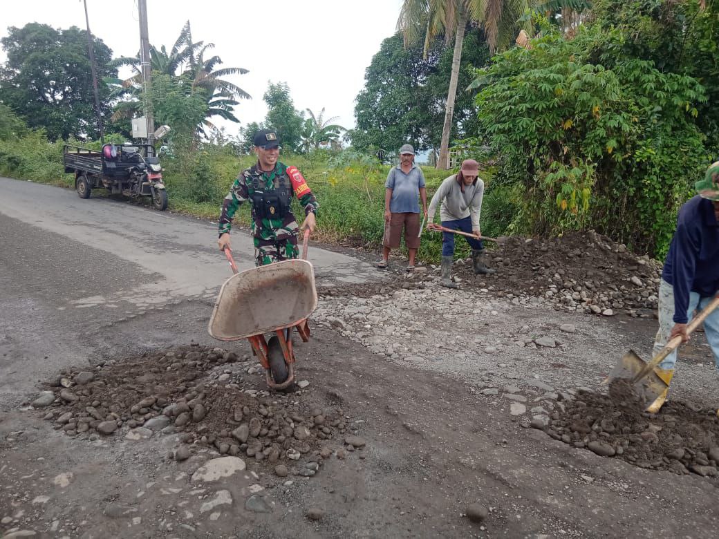 BONE – Semangat kebersamaan dan gotong royong, Babinsa Koramil 1407-14/Libureng Sertu Suprapto Arabe bersama warga timbun jalan berlubang di Desa Mario, Kec. Libureng, Kab….