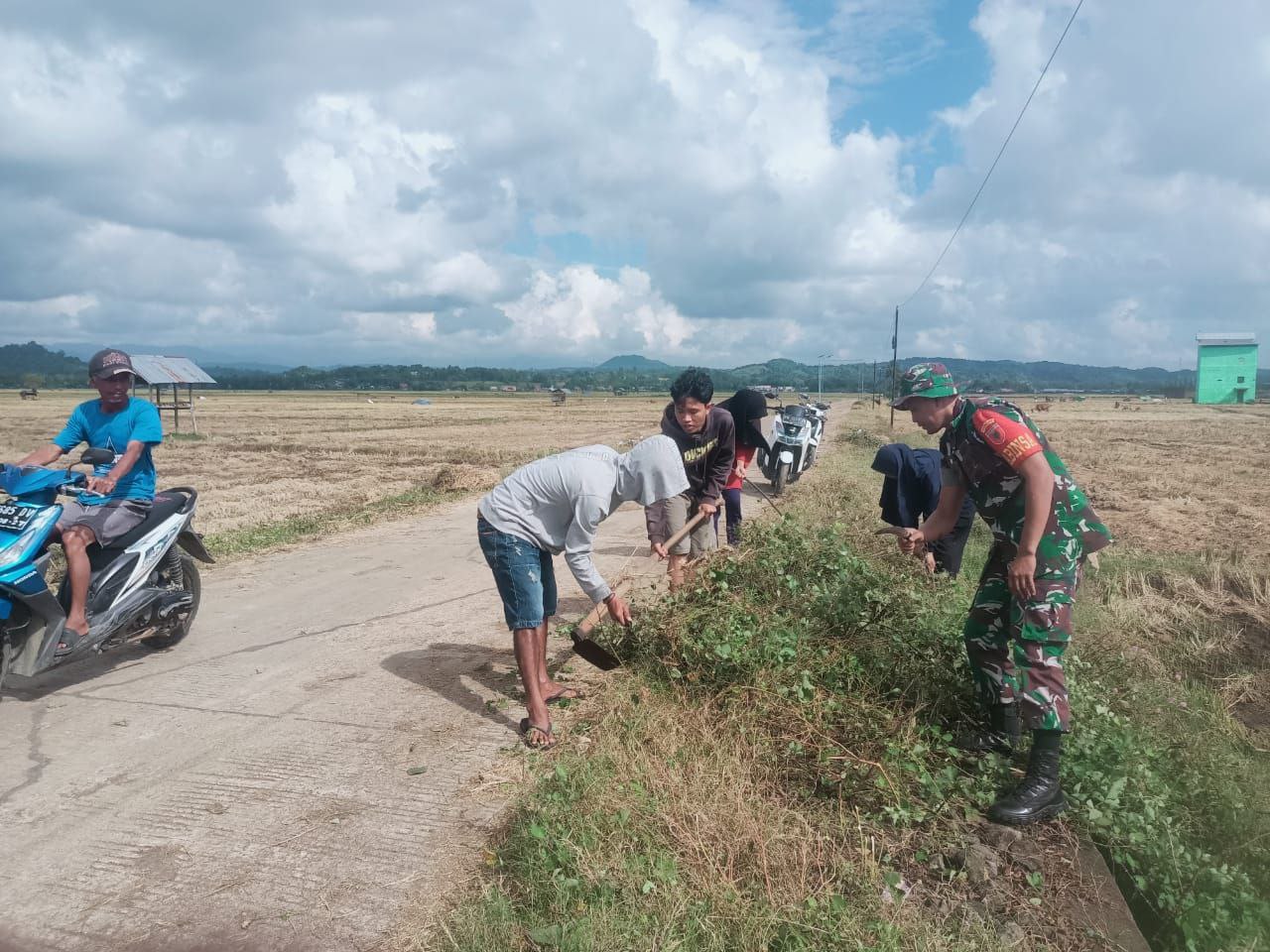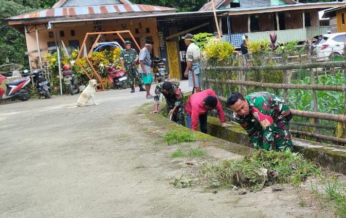 BONE – Kopda Andi Fahruddin Babinsa Koramil 18/Kajuara Kodim 1407/Bone bersama dengan warga setempat bahu membahu membersihkan jalan desa dari semak belukar, berlokasi di…